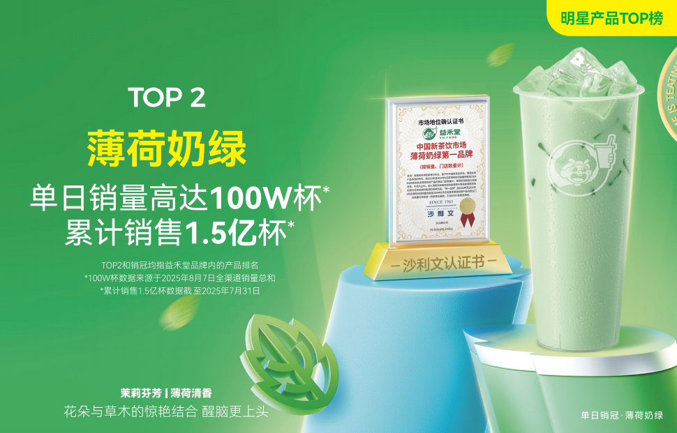 评审团从品牌创新全链路出发,对参赛作品进行多维度严格评审。益禾堂的明星产品 “益禾堂薄荷奶绿” 荣获 “年度饮品产品奖” 。该产品自上市以来,以其“茉莉芬芳、薄荷清香”的独特口感,迅速成为夏季饮品市场爆款,复购率持续领先。这不仅是益禾堂“产品力即生命力”研发理念的成功实践,也体现了品牌在茶饮健康化、风味精细化趋势下的敏锐洞察与响应能力。